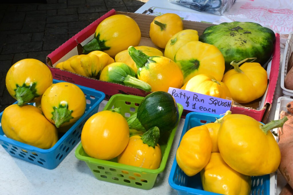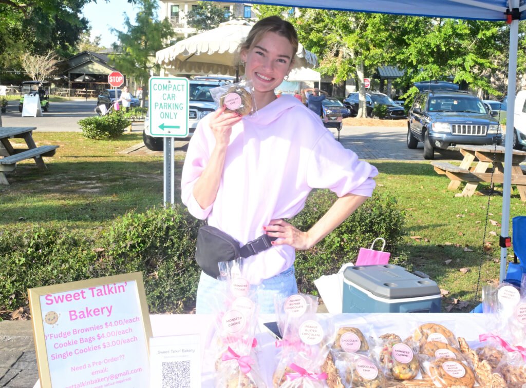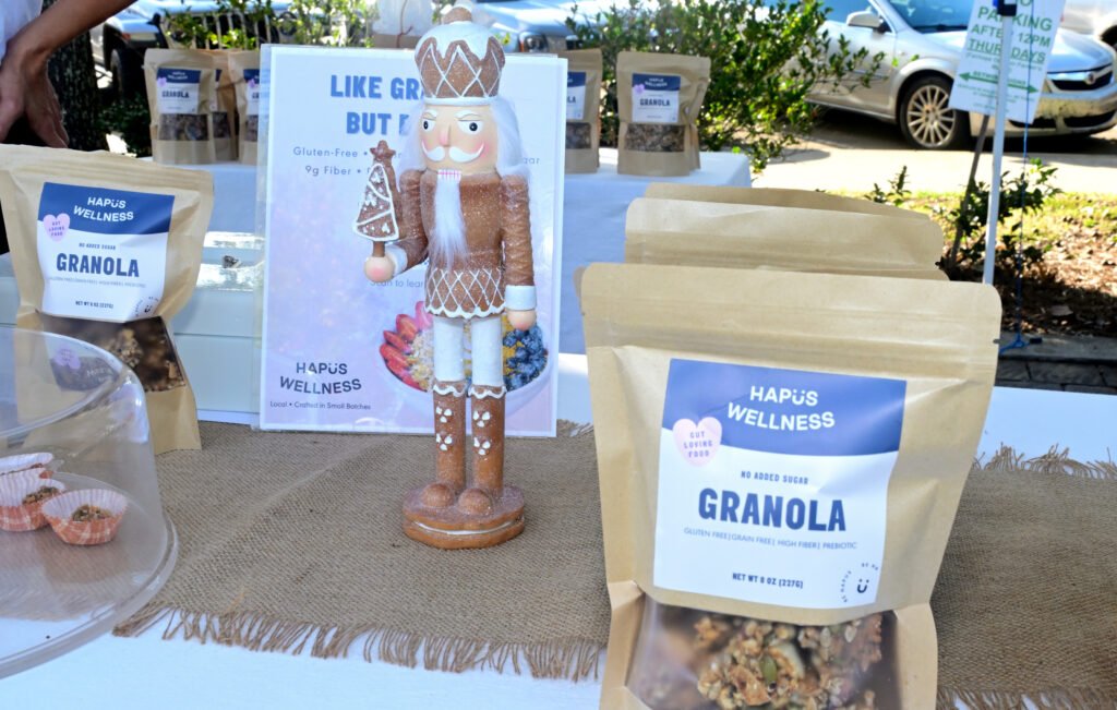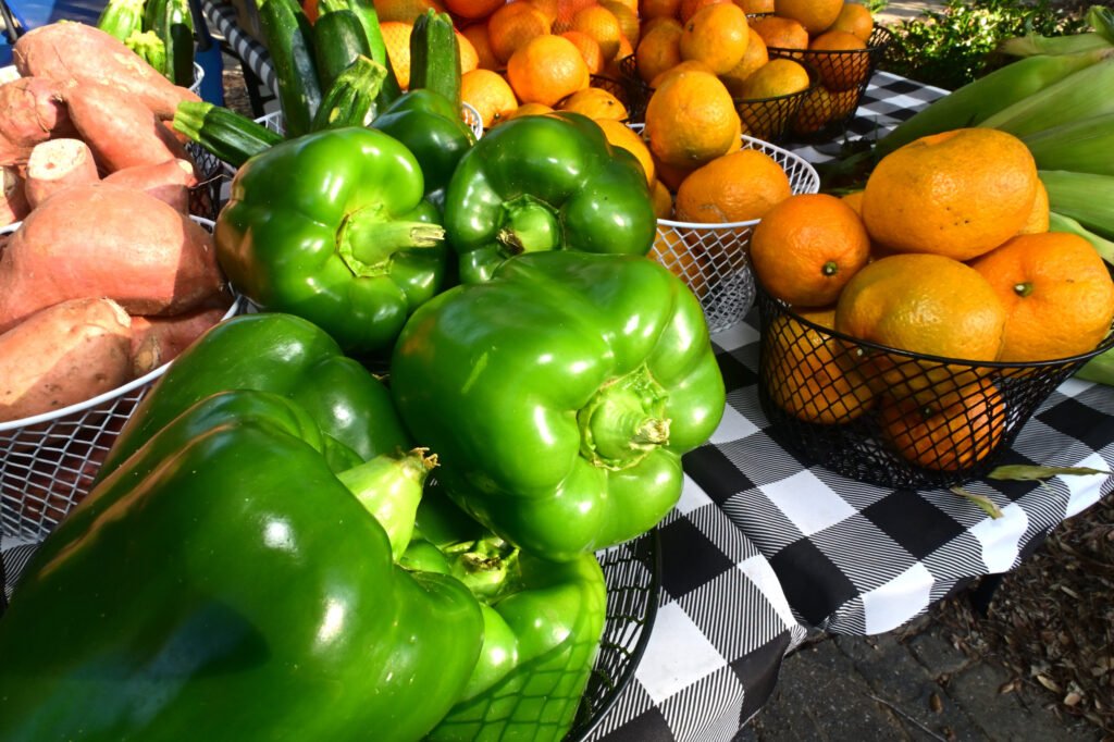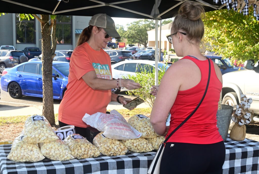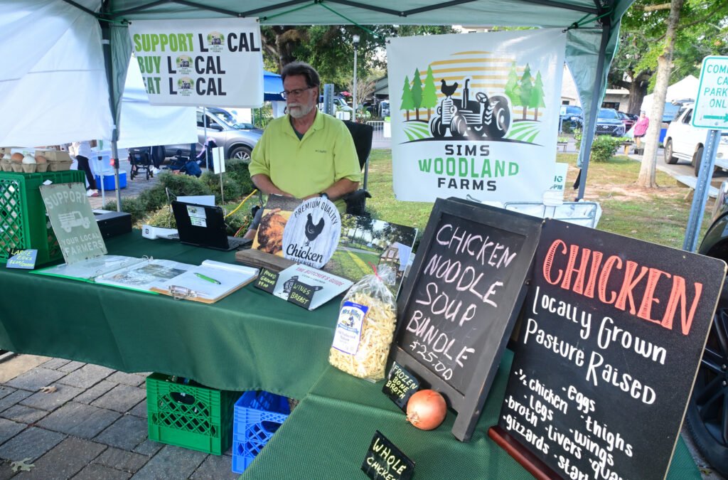 Loads of color at Fairhope’s fall Farmer’s Market. Vegetables, pasture-raised chicken, pasta, eggs, honey, granola, strawberry lemonade, flowers, popcorn, nuts, brownies, patty pan squash and more are featured here. Next week’s market–NOV 13th 2025–is the final market for the fall season…