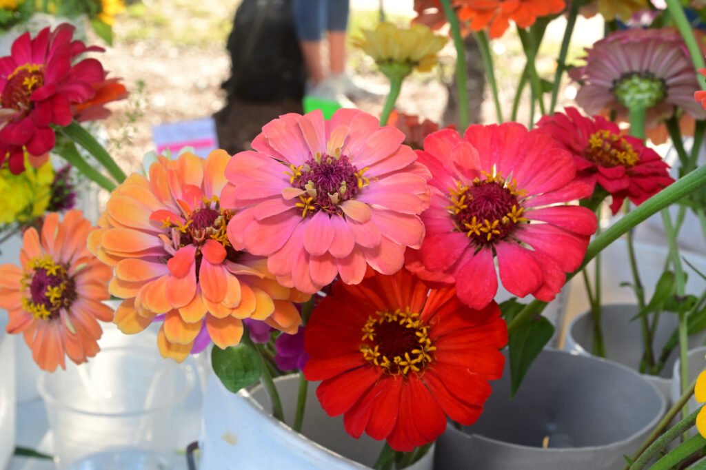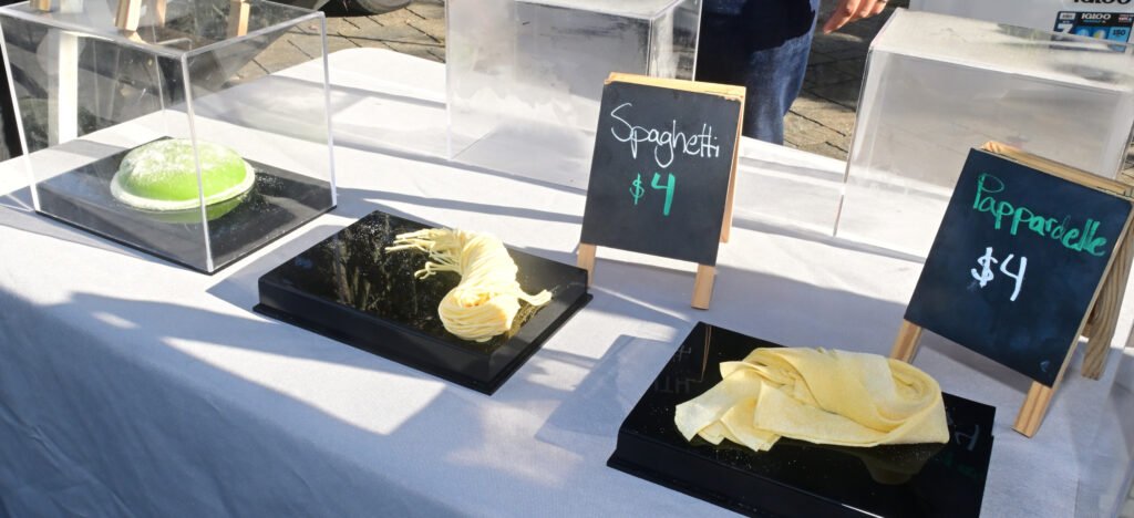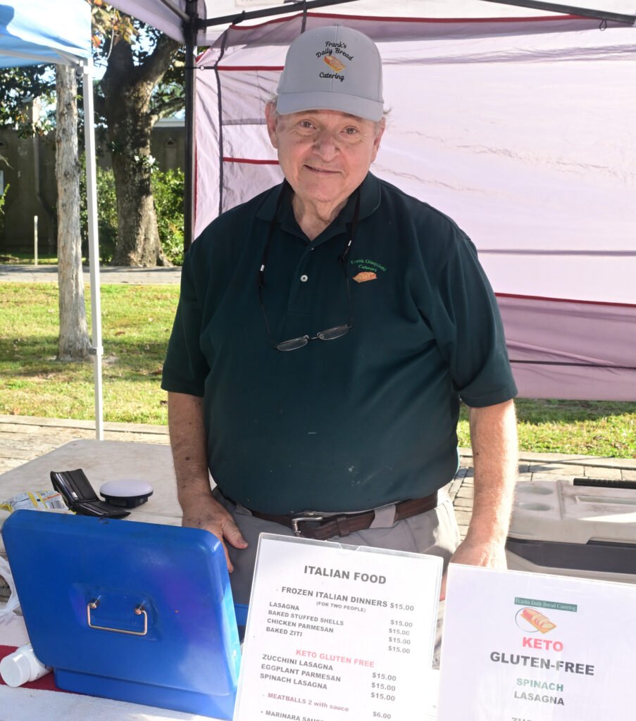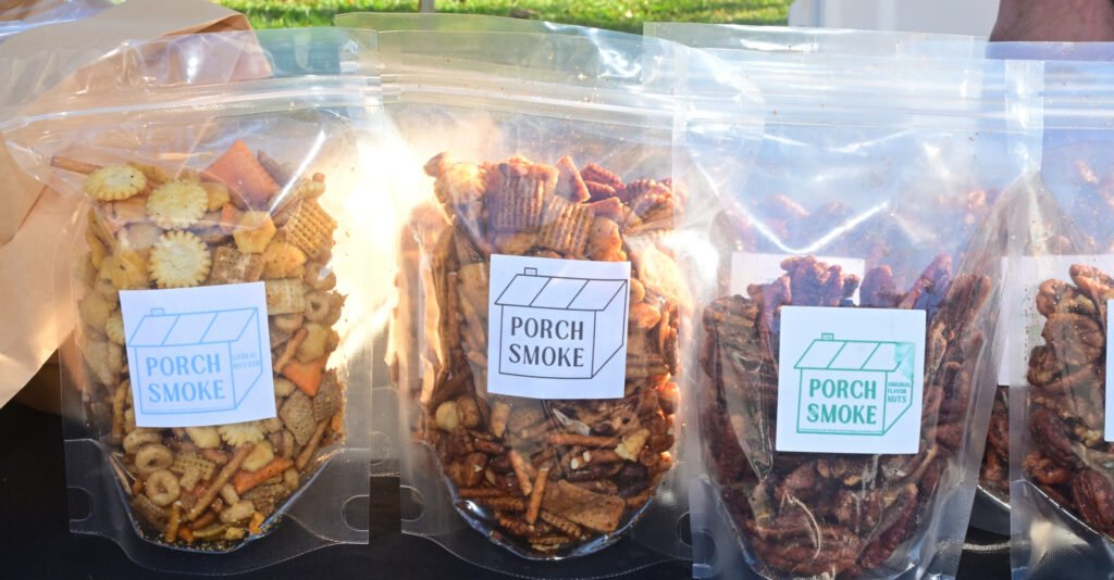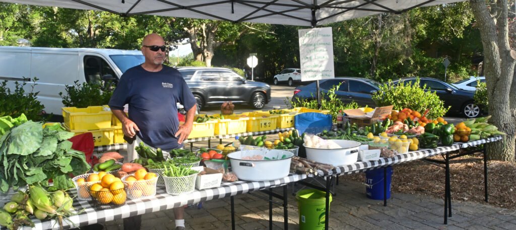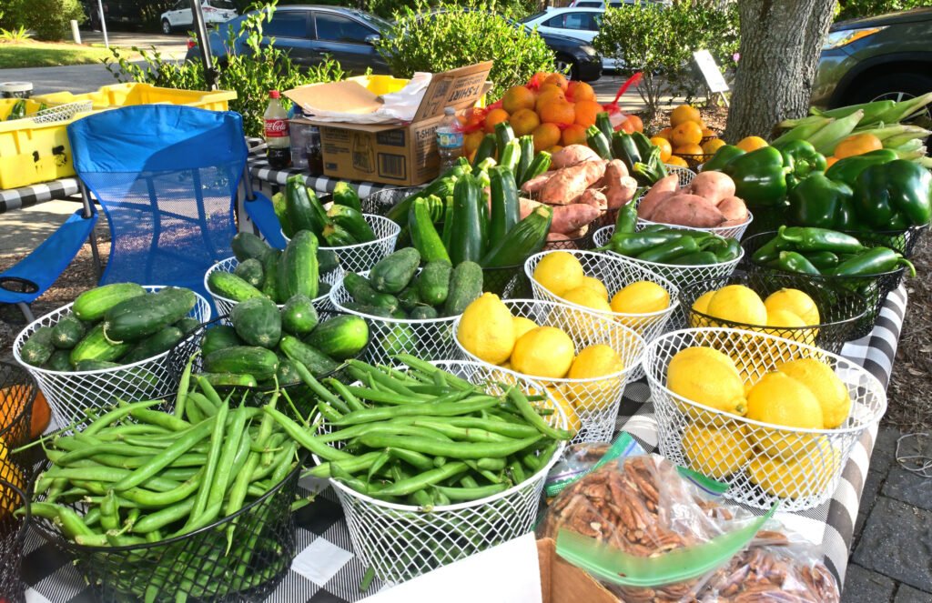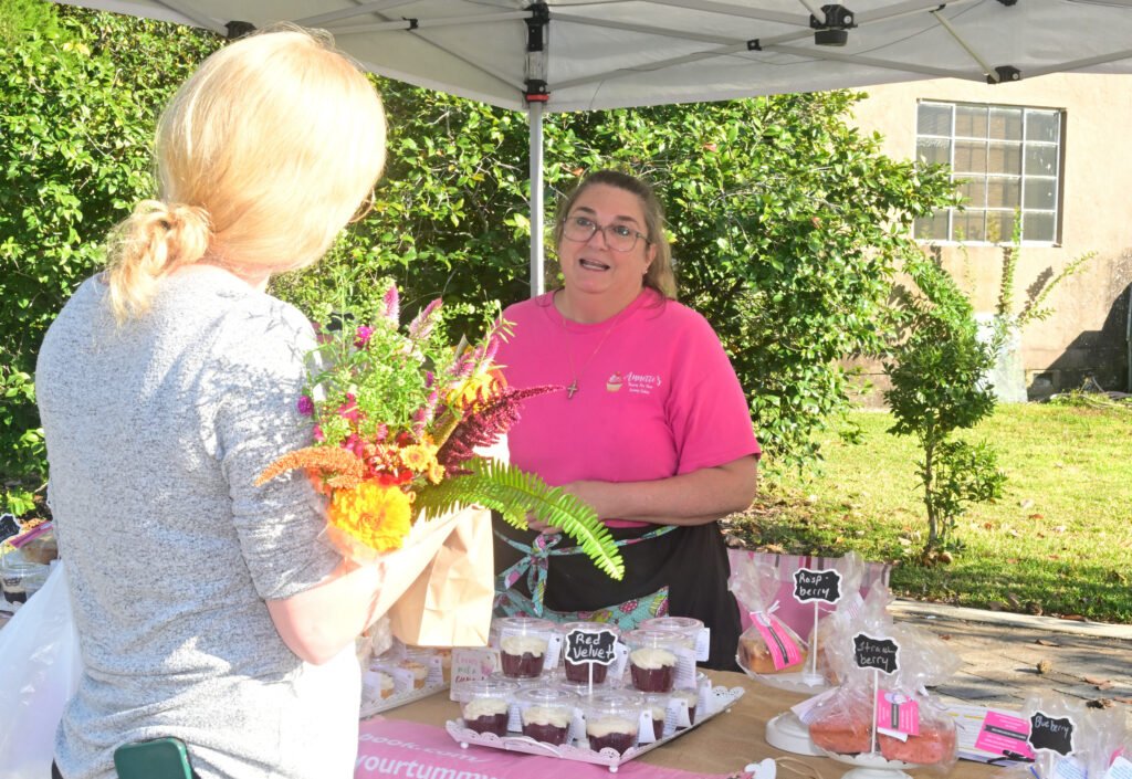 Loads of color at Fairhope’s fall Farmer’s Market. Vegetables, pasture-raised chicken, pasta, eggs, honey, granola, strawberry lemonade, flowers, popcorn, nuts, brownies, patty pan squash and more are featured here. Next week’s market–NOV 13th 2025–is the final market for the fall season…