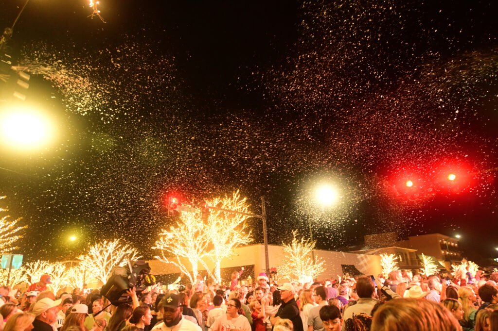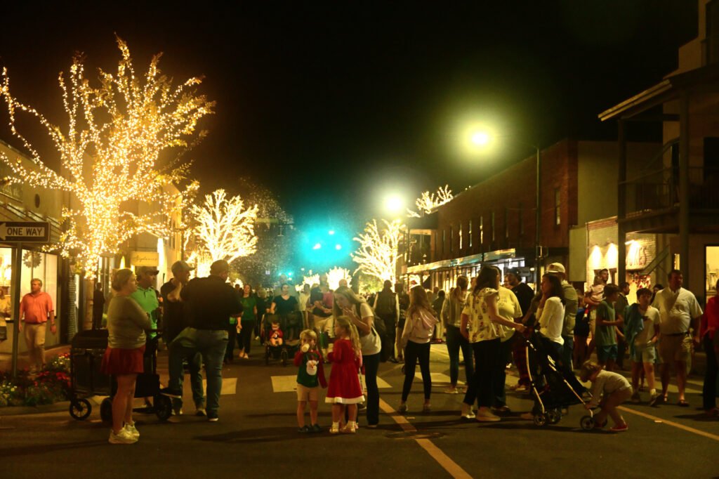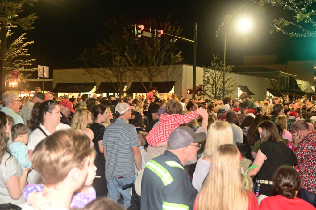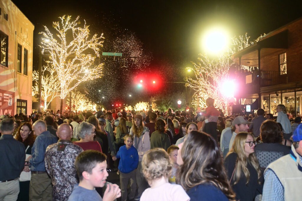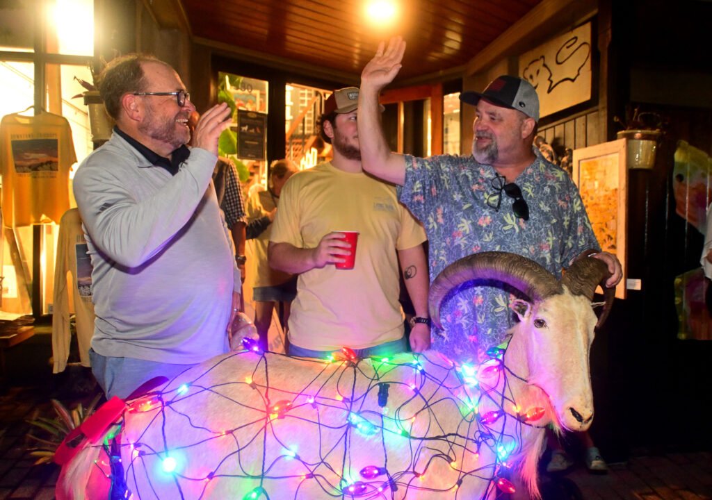 A tremendous crowd excitedly watches as the switch is thrown, lighting the trees through downtown Fairhope. Moments later, not to be outdone, members of Fairhope Sunset Rotary take part in the traditional lighting of the goat at Lyons Share framing and art gallery on De La Mare Ave. And, steps away, Matthew Jacquette entertains a crowd at The Book Cellar…